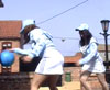 Those naughty twins always end up soaked. Wearing identical outfits of short white sports skirts, white socks, trainers, tops and tracksuit tops. After Melanie gets pushed in the pool she persuades Donna to come in with her. Two young girls having a great time in the water. Full natural sound really emphasises some fantastic wetlook action. (16 minutes)