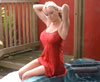 Sarah returns for yet another session in the hot tub - this time wearing a red satin nightie. Blonde and busty, you can see how she loves the hot water pouring all over her slip and soaking through to her body. Another for the lovers of satin. Had to dub music on this one, due to excessive wind noise, but we've tried something modern with this set. (13 minutes)