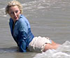 Another beach video with Jessie, wearing a long-sleeved dark blue blouse and short white skirt. As the tide comes in, the waves lap against her skirt. She sits in the water and lets it splash all over her shirt and hair. As she rolls in the surf, we get glimpses of pale blue soaked panties. (9 minutes)