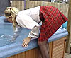 Before using the hot tub later, Jessie decides to ensure it's warm enough - and then manages to drop her house key into it. After several efforts, she decides the best thing is to get in there and find it. Her stockings will get wet, but can she keep her knee length red pleated skirt and silver-white blouse dry? I doubt it! (10 minutes)