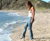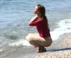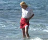 Wearing a mid-length beige skirt and red blouse, Liz strolls along the beach, dipping her shoes into the surf. The cooling water soon temps her to get the skirt wet. Then she can no longer resist, gives in and sits down in the waves. (10 minutes)